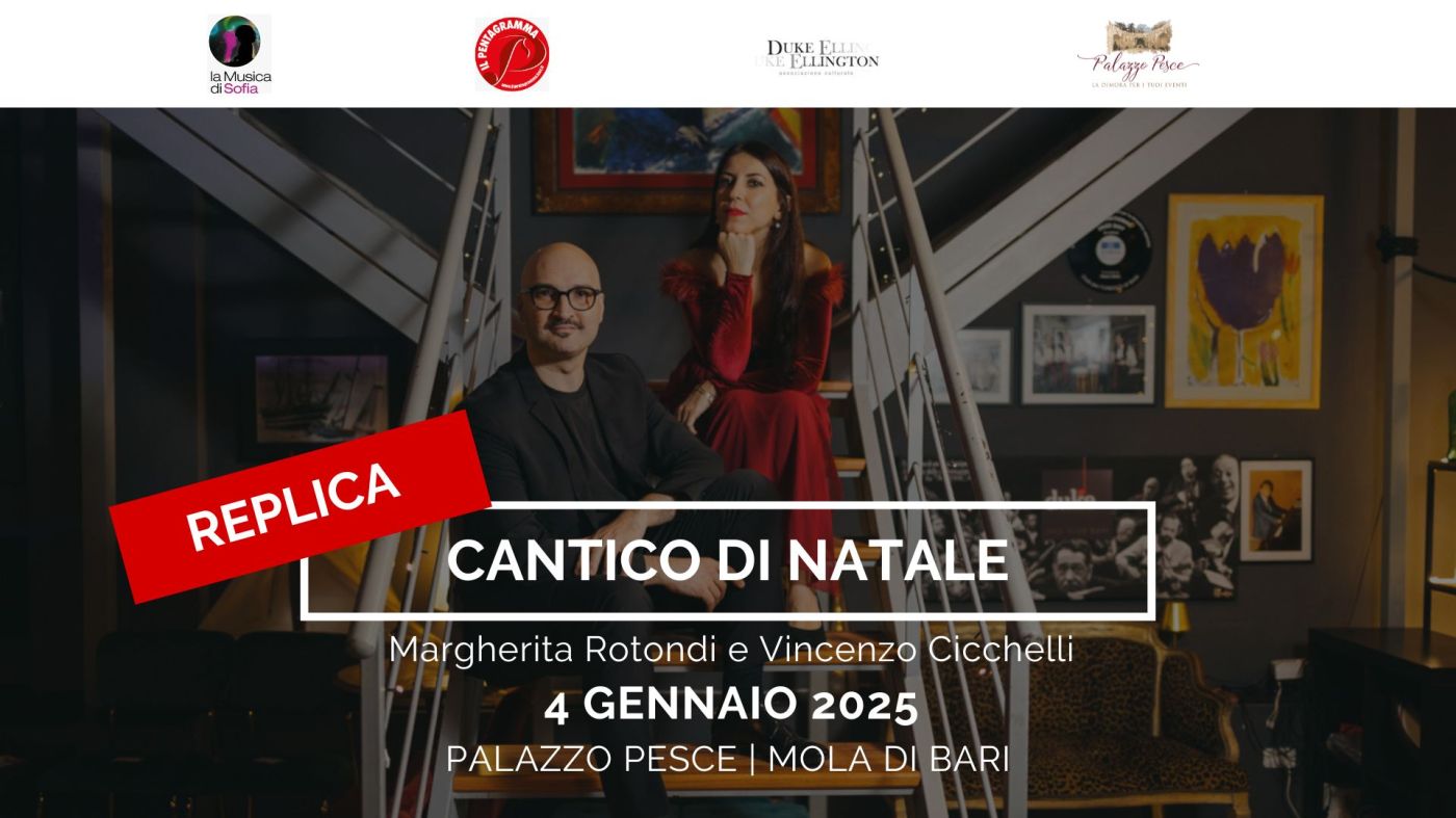 Sabato 4 gennaio 2025 alle ore 21.00 Palazzo Pesce a Mola di Bari rivive le atmosfere natalizie con “Cantico di Natale…melodie tradizionali dal mondo…” con il mezzosoprano Margherita Rotondi e il pianista Vincenzo Cicchelli.