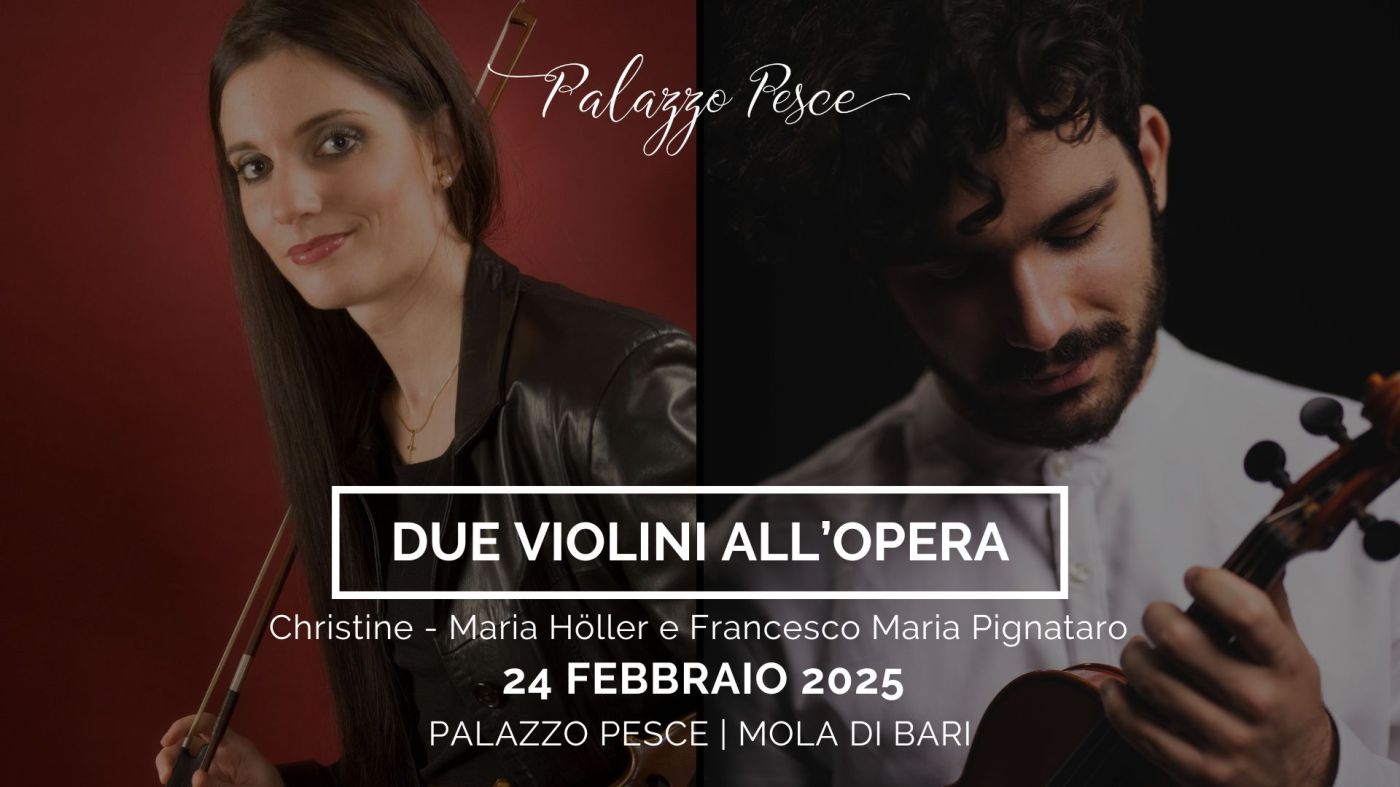 Un concerto in Puglia per ascoltare due secoli di musica: dalle fantasie su temi operistici di Mozart, Rossini e Verdi, passando per i “Capricci” di Henryk Wieniawski per concludere con la magnifica Danza macabra Op. 40 di Saint-Saëns. A guidare il pubblico in questo viaggio nei tempi e nei luoghi ci saranno Christine-Maria Höller, studi al Mozarteum di Salisburgo, diploma con lode con Helmut Zehetmair, perfezionamento con, tra gli altri, Lukas Hagen, Igor Ozim, Shmuel Ashkenasi, Gilles Apap, Rony Rogoff e Stefan Picard, una carriera che la vede esibirsi come solista con un violino Carlo Antonio Testore del 1755 in Austria, Germania, Italia, Croazia, Turchia e Argentina, e una appassionata attività di insegnamento al Mozarteum di Salisburgo in qualità di docente di Violino e Musica da camera, e Francesco Maria Pignataro, studi al Conservatorio Rota di Monopoli con Hans Van Dijk, perfezionamento con Christine-Maria Höller, studi nella classe di Christian Tachezi alla Gustav Mahler Privatuniversität für Musik di Klagenfurt am Wörthersee in Austria dove nel 2024 consegue il titolo di Bachelor in arti performative e una attività concertistica con un violino Bruno Montagne del 2014 insieme a orchestre e ensemble cameristici come Austria Festival Symphony Orchestra (Salisburgo), Alma Mahler Musikverein (Klagenfurt), Sinfonietta St. Johann (St. Johann im Pongau), Bad Reichenhaller Philharmoniker (Bad reichenhall).