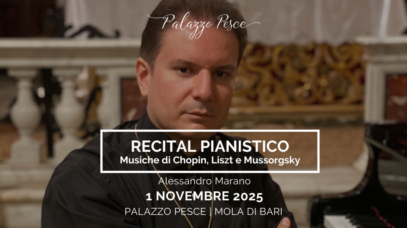 Sabato 1 novembre 2025 alle ore 21.00 Palazzo Pesce a Mola di Bari presenta il Recital pianistico di Alessandro Marano.