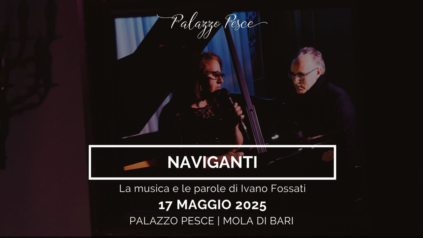 Sabato 17 maggio 2025 alle ore 21.00 Palazzo Pesce a Mola di Bari presenta Naviganti La musica e le parole di Ivano Fossati con Gianna Montecalvo voce e Michele Campobasso pianoforte.