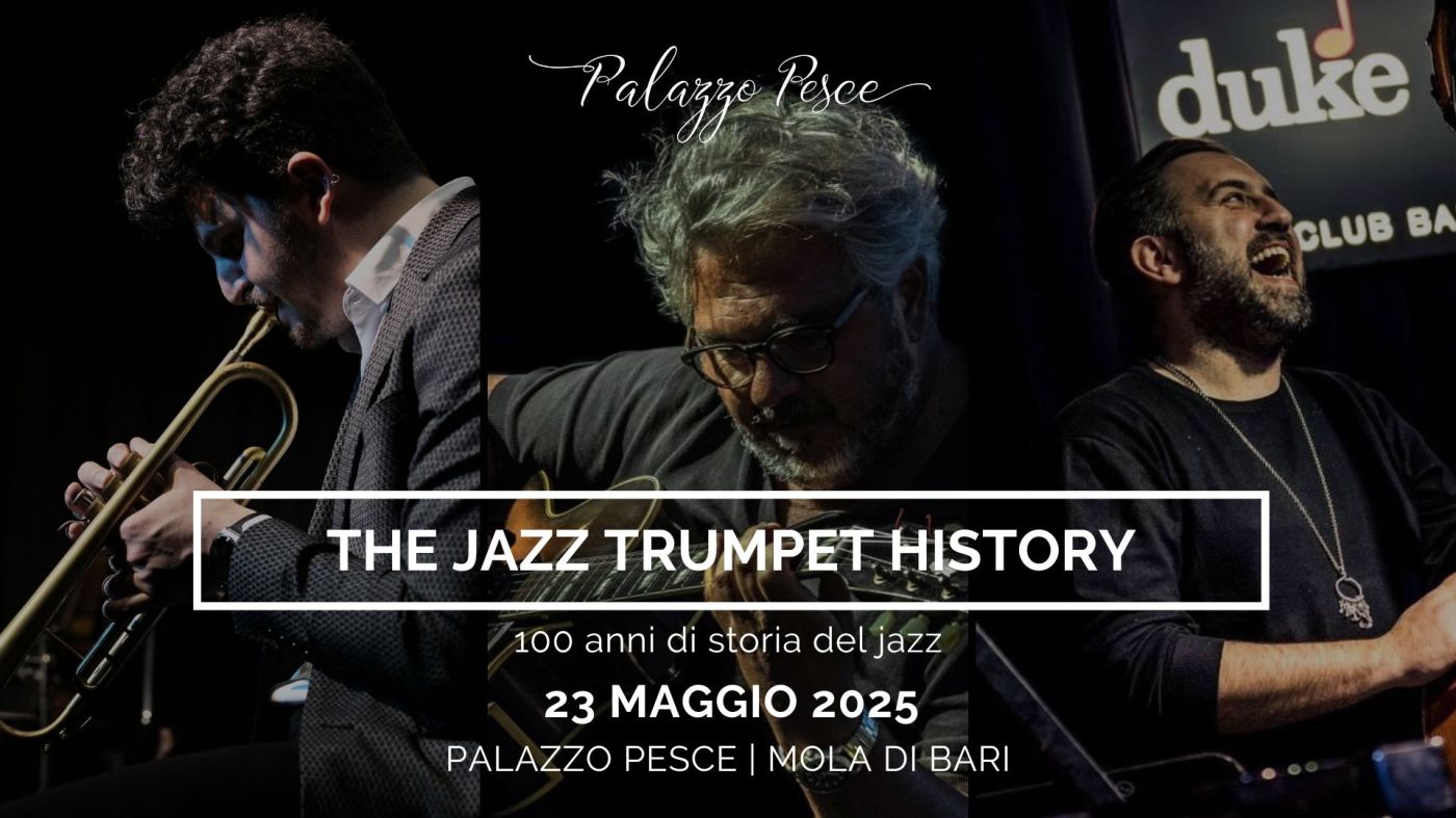 Venerdì 23 maggio 2025 alle ore 21.00 Palazzo Pesce a Mola di Bari presenta The jazz trumpet history 100 anni di storia del jazz con l’Alberto Di Leone Trio formato da Alberto Di Leone alla tromba, Guido Di Leone alla chitarra e Giampaolo Laurentaci al contrabbasso.