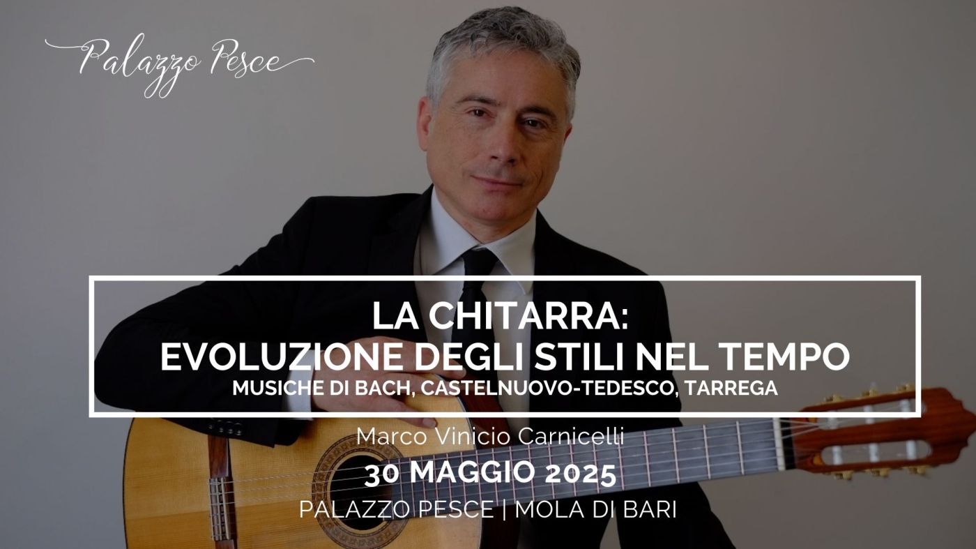 Venerdì 30 maggio 2025 alle ore 21.00 Palazzo Pesce a Mola di Bari presenta La chitarra: evoluzione degli stili nel tempo Musiche di Bach, Castelnuovo-Tedesco, Tarrega con Marco Vinicio Carnicelli alla chitarra.