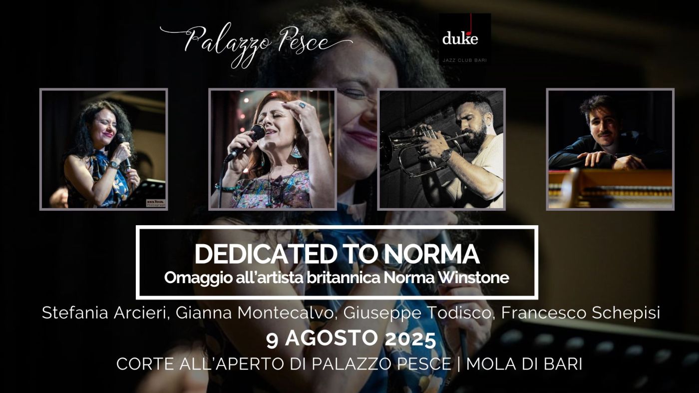 Sabato 9 agosto 2025 alle ore 21.00 la corte all’aperto di Palazzo Pesce a Mola di Bari, in collaborazione il Duke Jazz Club, presenta “DEDICATED TO NORMA Omaggio all’artista britannica Norma Winstone” con Stefania Arcieri & Gianna Montecalvo voci, Giuseppe Todisco tromba e flicorno e Francesco Schepisi pianoforte.