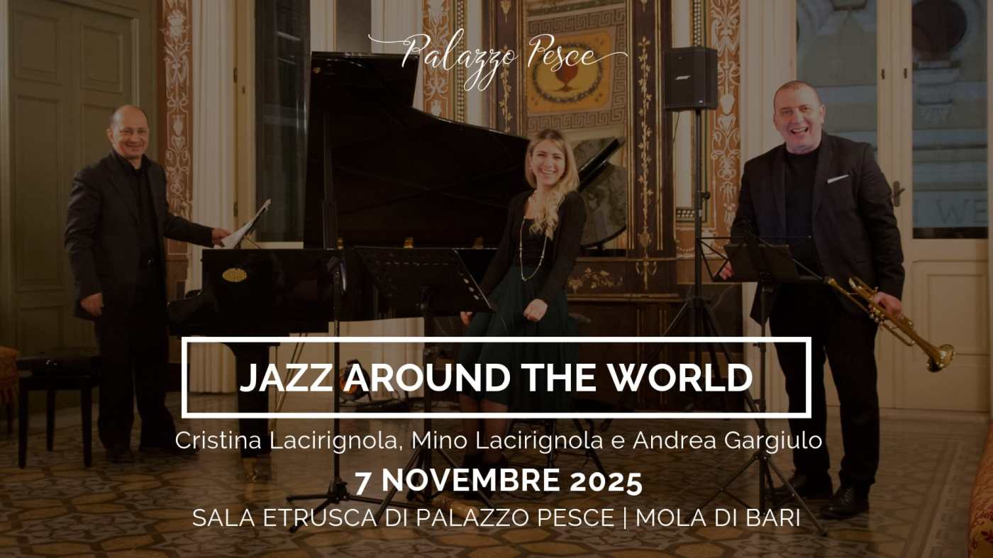 Venerdì 7 novembre 2025 alle ore 21.00 Palazzo Pesce presenta “Jazz Around the World” insieme alla voce di Cristina Lacirignola, la tromba di Mino Lacirignola e il pianoforte di Andrea Gargiulo.