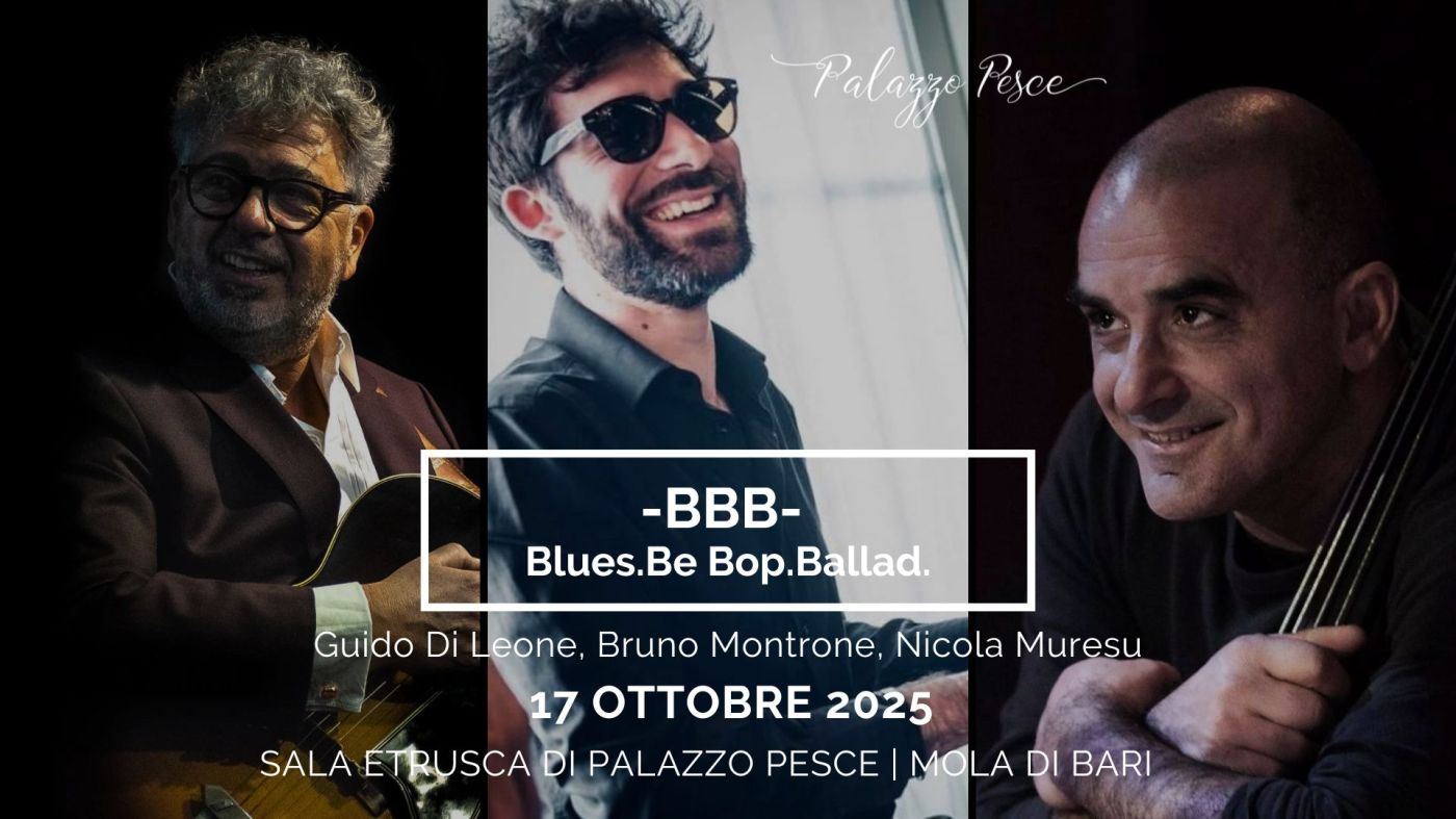 Venerdì 17 ottobre 2025 alle ore 21.00 Palazzo Pesce presenta “-BBB-Blues.Bebop.Ballad.” insieme a Guido Di Leone chitarra, Bruno Montrone piano e Nicola Muresu contrabbasso.