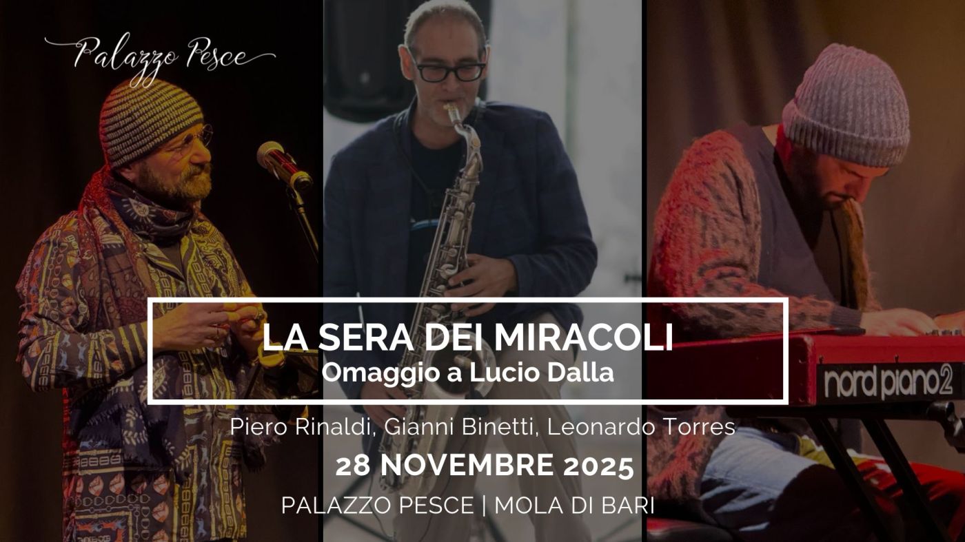 Venerdì 28 novembre 2025 alle ore 21.00 la Sala Etrusca di Palazzo Pesce a Mola di Bari presenta “LA SERA DEI MIRACOLI Omaggio a Lucio Dalla” con Piero Rinaldi voce, Gianni Binetti sax e Lonardo Torres tastiera.