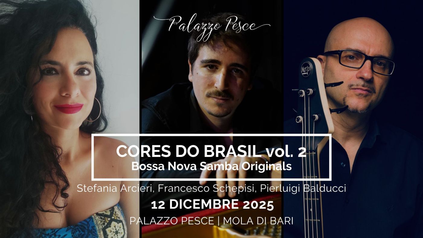 Venerdì 12 dicembre 2025 alle ore 21.00 la Sala Etrusca di Palazzo Pesce a Mola di Bari presenta “Cores do Brasil vol.2 Bossa Nova Samba Originals” insieme a Stefania Arcieri voce, composizioni, Francesco Schepisi pianoforte e Pierluigi Balducci basso elettrico.