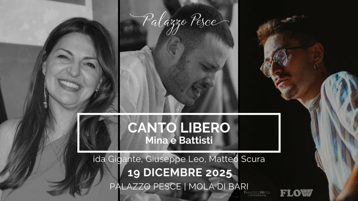 Venerdì 19 dicembre 2025 alle ore 21.00 la Sala Etrusca di Palazzo Pesce a Mola di Bari presenta “Canto libero Mina e Battisti” insieme a Ida Gigante voce, Giuseppe Leo pianoforte e Matteo Scura batteria