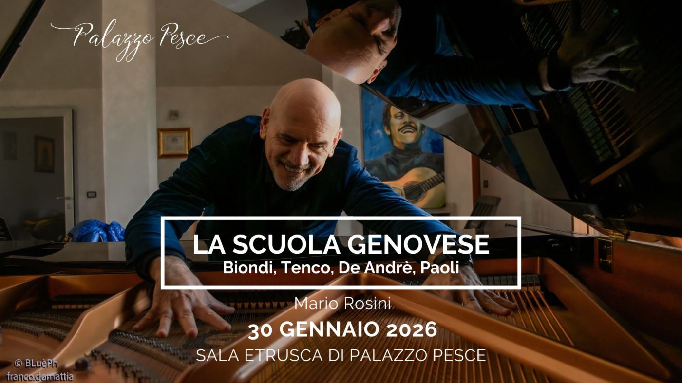 Venerdì 30 genanio 2026 alle ore 21.00, Palazzo Pesce presenta La scuola Genovese Biondi, Tenco, De Andrè, Paoli con Mario Rosini alla voce e pianoforte.