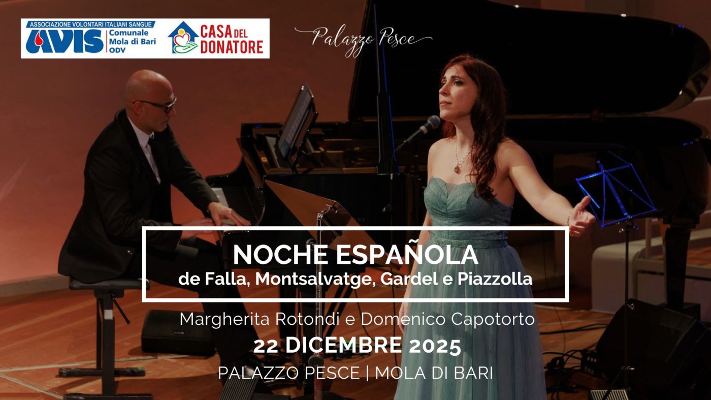 Lunedì 22 dicembre dicembre 2025 alle ore 20.30 la Casa del donatore di Mola di Bari – AVIS, in collaborazione con Palazzo Pesce di Mola di Bari, presenta “Noche Española Musiche di De Falla, Montsalvatge, Gardel e Piazzolla” con Margherita Rotondi mezzosoprano e Domenico Capotorto al pianoforte.