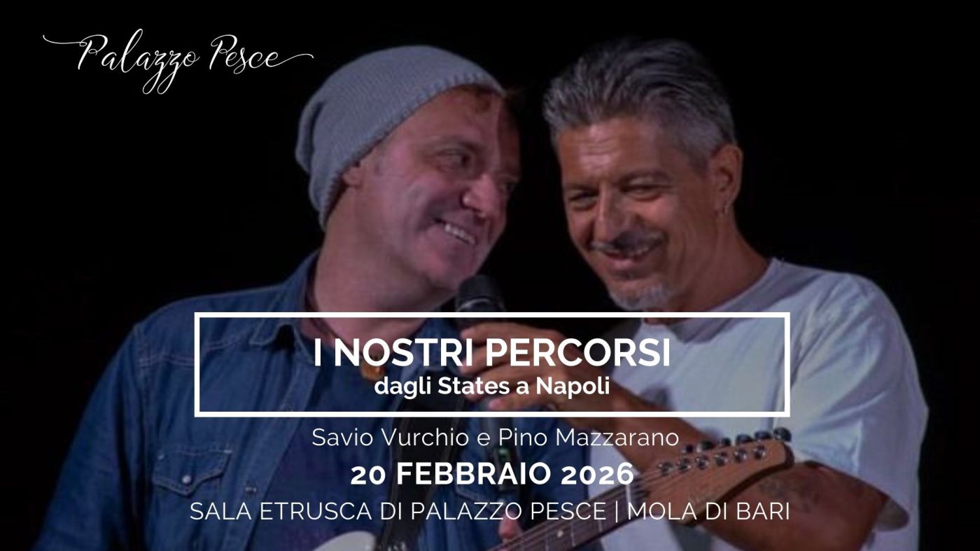Venerdì 20 febbraio 2026 alle ore 21.00 la Sala Etrusca di Palazzo Pesce a Mola di Bari presenta “I nostri percorsi. Dagli States a Napoli” insieme alla voce di Savio Vurchio e alla chitarra di Pino Mazzarano.
