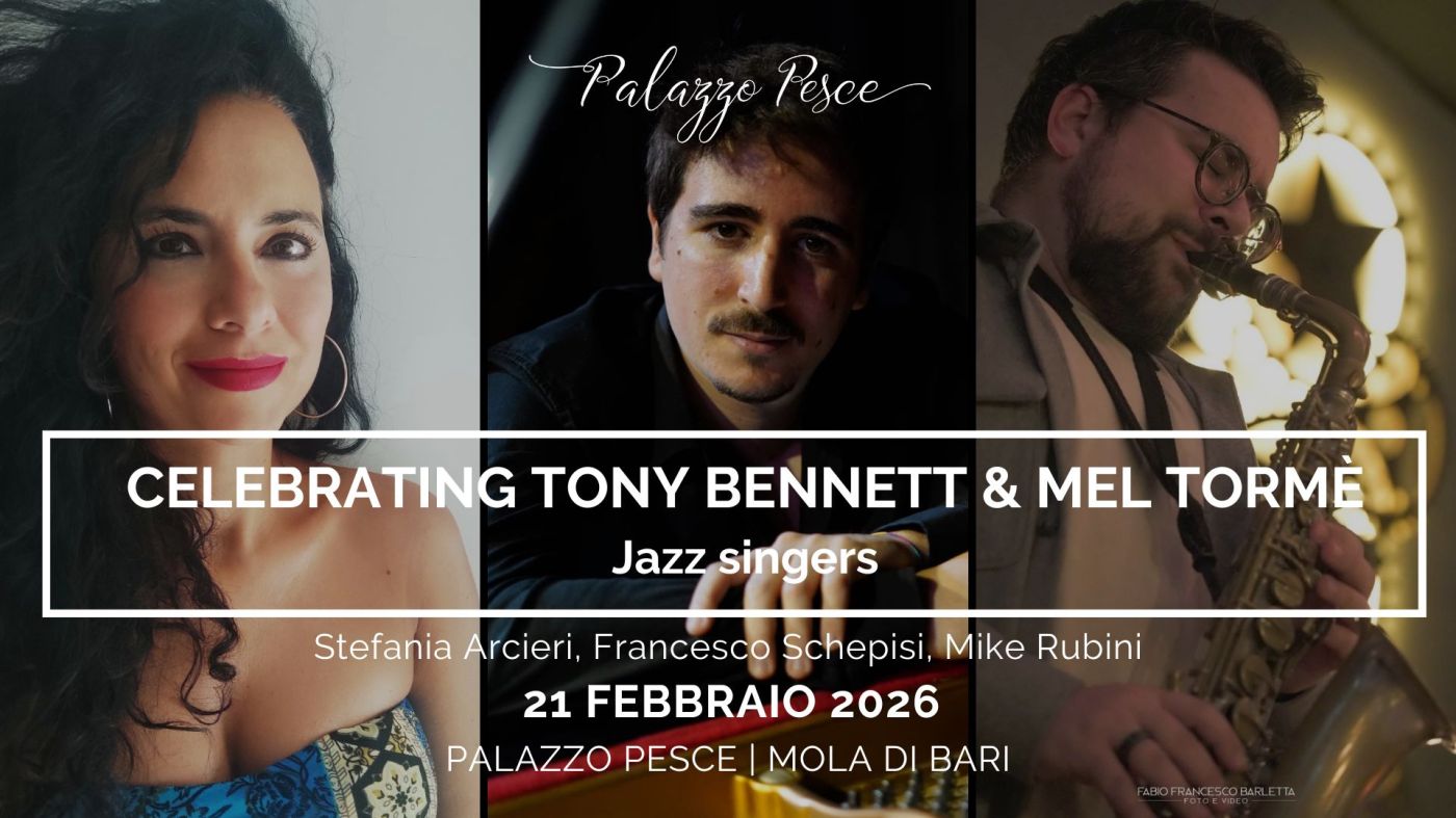 Sabato 21 febbraio 2026 ore 21.00 Palazzo Pesce a Mola di Bari presenta Celebrating Tony Bennett & Mel Tormè Jazz singers con Stefania Arcieri voce, Francesco Schepisi pianoforte e Mike Rubini sax alto