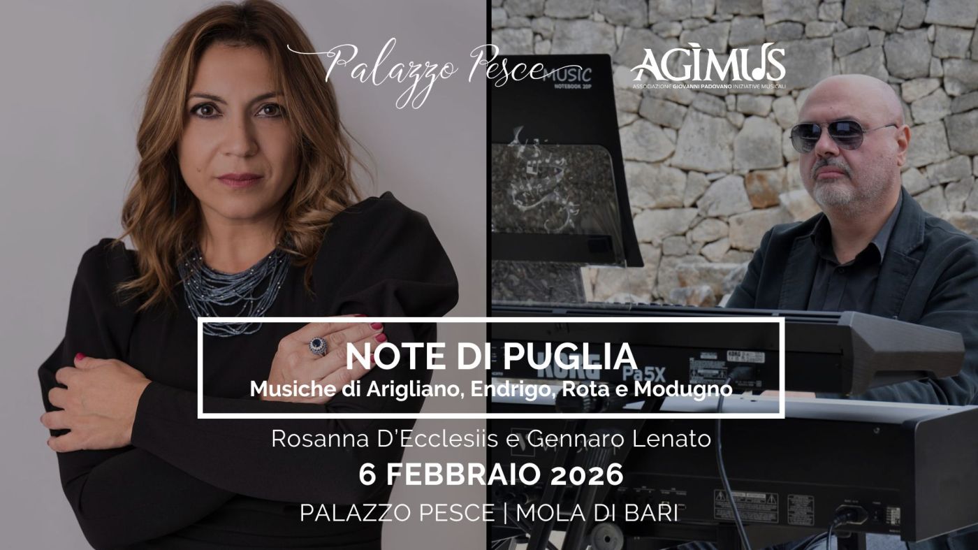 Venerdì 6 febbraio 2026 alle ore 21.00, Palazzo Pesce, in collaborazione con Agìmus, presenta Note di Puglia Suoni, voci e storie dal tacco d’Italia. Musiche di Nicola Arigliano, Sergio Endrigo, Nino Rota e Domenico Modugno con Rosanna D’Ecclesiis voce e Gennaro Lenato pianoforte.