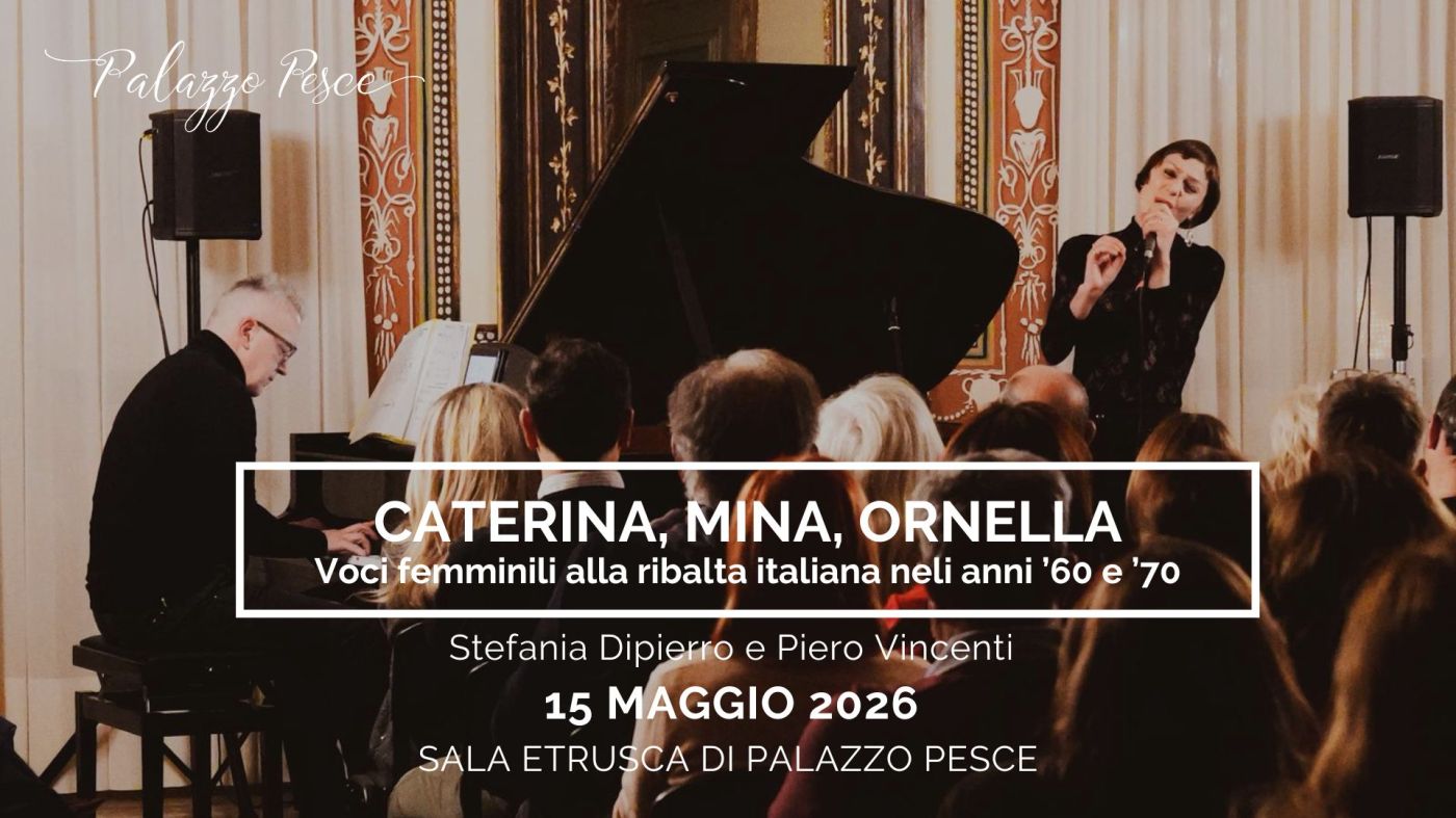 Venerdì 15 maggio 2026 alle ore 21.00 la Sala Etrusca di Palazzo Pesce presenta Caterina Mina Ornella Voci femminili alla ribalta italiana negli anni ’60 e ’70 con Stefania Dipierro voce e Piero Vincenti al pianoforte.