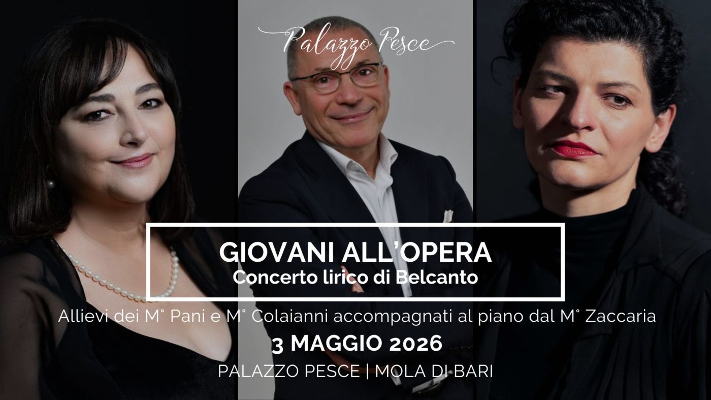 Domenica 3 maggio 2026 ore 19.00 presso la Sala Etrusca di Palazzo Pesce a Mola di Bari si terrà “GIOVANI ALL’OPERA” un Concerto Lirico dedicato al BELCANTO a cura della prof.ssa Maria Grazia Pani e del Maestro Domenico Colaianni, docenti di canto presso il Conservatorio Piccinni di Bari. Al pianoforte ci sarà la Prof.ssa Angela Zaccaria docente al Conservatorio Giordano di Foggia.