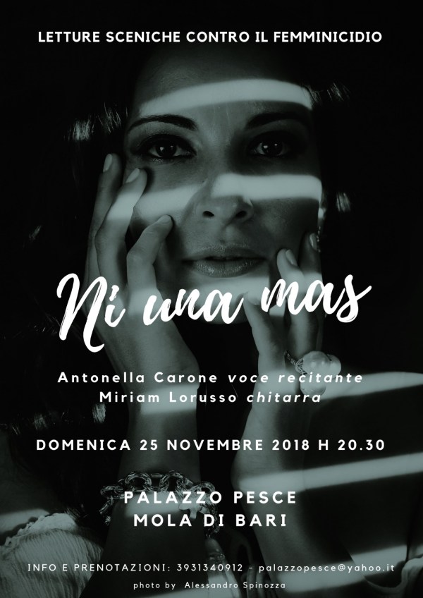 Domenica 25 novembre 2018 alle ore 20.30 Palazzo Pesce si raccoglie in riflessione con “Ni una mas. Letture sceniche contro il femminicidio” insieme alla voce recitante di Antonella Carone e agli interventi musicali di Miriam Lorusso. Un recital teatrale in Puglia in occasione della giornata internazionale contro la violenza sulle donne fatto di racconti, veri,... Continua a leggere →