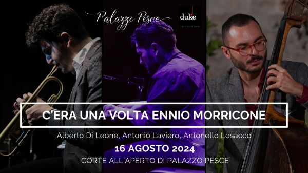 Venerdì 16 agosto 2024 alle ore 21.30 la corte all'aperto di Palazzo Pesce, in collaborazione con il Duke Jazz Club, presenta “C'era una volta Ennio Morricone" con Alberto Di Leone alla tromba e flicorno, Antonio Laviero al piano e Antonello Losacco al contrabbasso e basso elettrico. Il trio omaggia la musica di uno trai più... Continua a leggere →