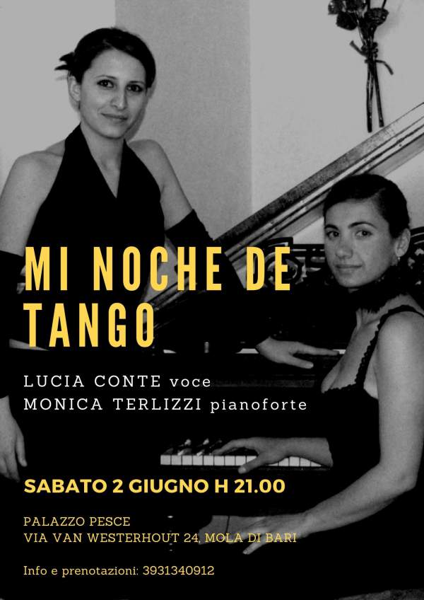 Sabato 2 giugno alle ore 21.00 le pareti di Palazzo Pesce a Mola di Bari risuoneranno delle note di Mi Noche de Tango, un tributo al tango argentino con il soprano Lucia Conte e la pianista Monica Terlizzi. Dai grandi classici di Carlos Gardel fino all’arte espressionista di Astor Piazzolla sarà ripercorsa la storia malinconica... Continua a leggere →