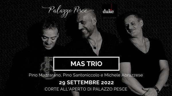 Giovedì 29 settembre 2022 alle ore 21.00 la Sala Etrusca di Palazzo Pesce a Mola di Bari ospita il Mas Trio con Pino Mazzarano alla chitarra, Pino Santoniccolo al basso e Michele Abruzzese alla batteria. Un concerto in Puglia, in collaborazione con il Duke Jazz Club, che nasce da un progetto che parla della collaborazione... Continua a leggere →