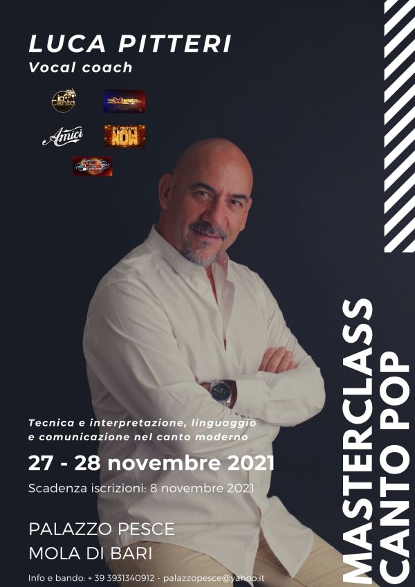 Sabato 27 e domenica 28 novembre 2021 Palazzo Pesce ospita la II Masterclass in Canto pop tenuta da Luca Pitteri, vocal coach di fama internazionale e docente di Canto nelle prime sei edizioni della trasmissione “Amici di Maria De Filippi” su Canale 5. Un’opportunità unica in Puglia per approfondire gli aspetti legati a tecnica e interpretazione, linguaggio e... Continua a leggere →