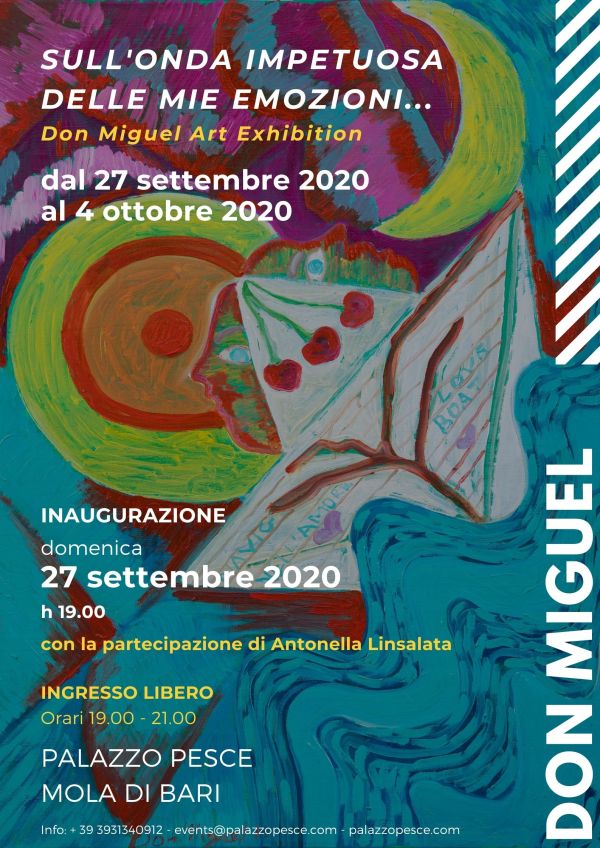 Domenica 27 settembre 2020 alle ore 19.00 Palazzo Pesce inaugura “Sull’onda impetuosa delle mie emozioni”, la personale di Don Miguel, con la partecipazione dell'Assessore alla Cultura Lucia Parchitelli e di Antonella Linsalata.Una mostra in Puglia dal 27 settembre al 4 ottobre 2020 – orari di visita dalle 19.00 alle 21.00, ingresso libero – per ammirare... Continua a leggere →