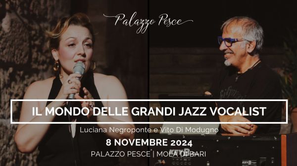 Venerdì 8 novembre 2024 alle ore 21.00 Palazzo Pesce a Mola di Bari presenta “Il mondo delle grandi jazz vocalist: Sarah Vaughan, Ella Fitzgeraldo e Billie Holiday” insieme alla voce di Luciana Negroponte e al piano ed hammond Vito di Modugno. Un'immersione profonda in una musica che ha definito l'arte del canto jazz attraverso le voci di leggende come Ella Fitzgerald, Sarah Vaughan,... Continua a leggere →