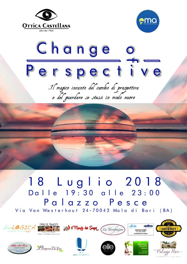 Il 18 Luglio Ema Consulting in collaborazione con Ottica Castellana presenta Change of Perspective. Una magica serata in cui si potranno scoprire Nuove Forme di Prospettiva. Are you ready? Ingresso libero mercoledì 18 luglio 2018 h 19.30 - 23.00| Corte di Palazzo Pesce via Van Westerhout 24, Mola di Bari Info: 3931340912 – palazzopesce@yahoo.it Scopri tutta la programmazione... Continua a leggere →