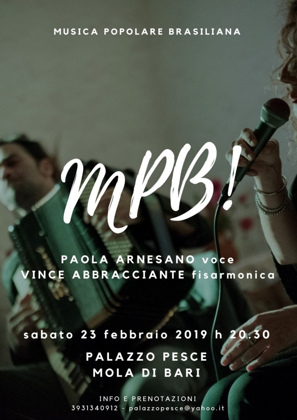 Sabato 23 febbraio 2019 alle ore 20.30 Palazzo Pesce vivrà tutte le emozioni della MPB, la musica popolare brasiliana, insieme a Paola Arnesano e Vince Abbracciante. Un concerto in Puglia che celebrerà la musica carioca dall’inizio del XX secolo a oggi con tutta la gamma di sentimenti e stati d’animo viscerali di cui è intrisa.... Continua a leggere →