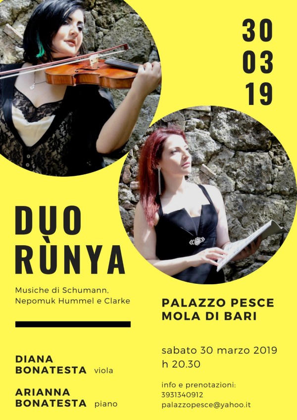Sabato 30 marzo 2019 alle ore 20.30 Palazzo Pesce è il palcoscenico dal quale si esibirà Il Duo Rùnya formato dalle sorelle Diana e Arianna Bonatesta. Un concerto in Puglia che ripercorre la grande storia della musica attraverso le raffinate sonorità della viola accompagnata dal pianoforte. Robert Schumann, Johann Nepomuk Hummel e Rebecca Clarke: tre... Continua a leggere →