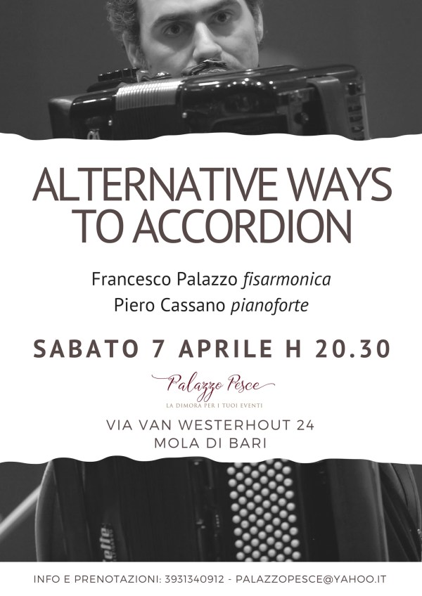 Sabato 7 aprile alle ore 20.30 le stanze di Palazzo Pesce risuoneranno con "Alternative ways to Accordion", un recital dedicato alla fisarmonica classica di Francesco Palazzo. Primo musicista in Italia a conseguire il diploma in Fisarmonica, Francesco Palazzo guiderà il pubblico attraverso percorsi alternativi e differenti da quelli solitamente tracciati: il suo strumento andrà oltre... Continua a leggere →