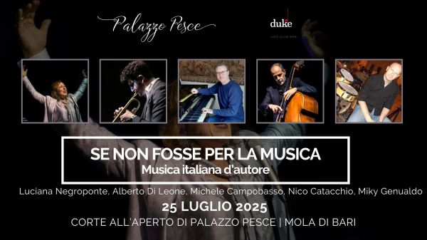 Venerdì 25 luglio 2025 alle ore 21.00 la corte all'aperto di Palazzo Pesce a Mola di Bari, in collaborazione il Duke Jazz Club di Bari, presenta “Se non fosse per la musica Musica italiana d’autore" insieme a Luciana Negroponte voce, Alberto Di Leone tromba, Michele Campobasso piano, Nico Catacchio contrabasso e Miky Genualdo batteria. La meravigliosa musica italiana d'autore, Dalla,... Continua a leggere →