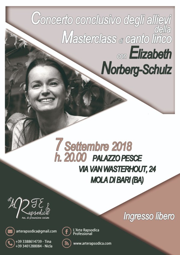 Si terrà venerdì 7 settembre il Concerto conclusivo degli allievi della Masterclass di canto lirico, a cura dell’Associazione L’Arte Rapsodica, tenuta dal celebre soprano internazionale  M° ELIZABETH NORBERG-SCHULZ: l’appuntamento è presso Palazzo Pesce, Mola di Bari (BA), alle ore 20.00. Ad esibirsi, i migliori talenti della Masterclass selezionati dalla docente tra i 18 allievi iscritti provenienti... Continua a leggere →