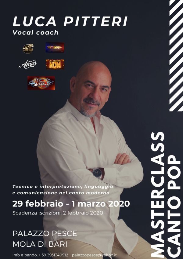 Sabato 29 febbraio e domenica 1 marzo 2020 Palazzo Pesce ospita la Masterclass in Canto pop tenuta da Luca Pitteri, vocal coach di fama internazionale e docente di Canto nelle prime sei edizioni della trasmissione “Amici di Maria De Filippi” su Canale 5. Un’opportunità unica in Puglia per approfondire gli aspetti legati a tecnica e... Continua a leggere →