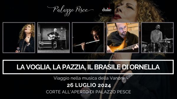 Venerdì 26 luglio 2024 alle ore 21.30 la corte all'aperto di Palazzo Pesce, in collaborazione con il Duke Jazz Club, presenta “TLa voglia, la pazzia, il Brasile di Ornella. Viaggio nella musica della Vanoni” insieme alla voce di Paola Arnesano, la chitarra e arrangiamenti di Max Monno, il flauto di Aldo Di Caterino, il basso di Gianluca... Continua a leggere →