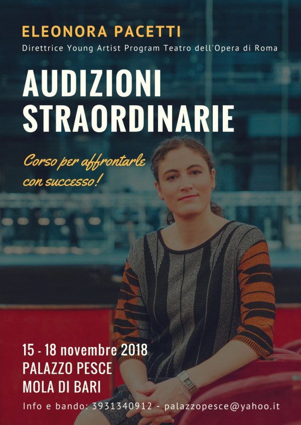 Da giovedì 15 a domenica 18 novembre 2018, Palazzo Pesce sarà la cornice in cui si terrà il corso, organizzato in collaborazione con l'Associazione Agimus di Mola di Bari, rivolto ai cantanti lirici tenuto da Eleonora Pacetti. Un’opportunità unica in Puglia per analizzare, in ogni aspetto, gli strumenti più importanti per ottenere lavoro e farsi conoscere... Continua a leggere →