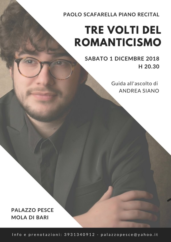 Sabato 1 dicembre 2018 alle ore 20.30 Palazzo Pesce racconta i “Tre volti del Romanticismo” insieme al pianista Paolo Scafarella. Un concerto in Puglia in cui risuoneranno le note eterne di Robert Schumann, Frédéric Chopin e Sergei Rachmaninov: tre compositori che rappresentano, ciascuno con la propria personalità unica, tre facce distinte della poetica musicale romantica.... Continua a leggere →