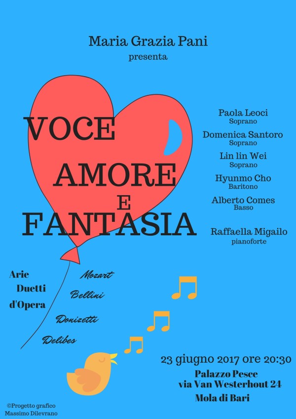 Concerto di Belcanto a cura del soprano Maria Grazia Pani 23 giugno Palazzo Pesce ore 20.30. Mola di Bari Dopo il grande successo ottenuto a maggio presso l’Auditorium Vallisa di Bari, torna sulle scene pugliesi “Voce, Amore e Fantasia” , concerto di Belcanto a cura della prof.ssa Maria Grazia Pani, affermata soprano e regista e... Continua a leggere →