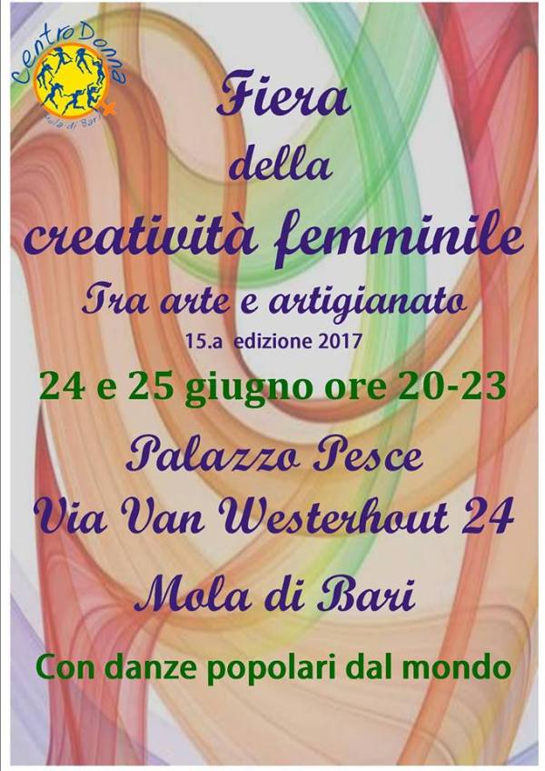 Anche quest’anno si svolgerà a Mola di Bari la Fiera della Creatività Femminile, organizzata dal Centro Donna. Nuova location Palazzo Pesce in via Van Westerhout 24, di fronte al Teatro Comunale; le date sono il 24 e il 25 giugno dalle ore 20 in poi. Come sempre sarà un’iniziativa che ha lo scopo di mostrare... Continua a leggere →