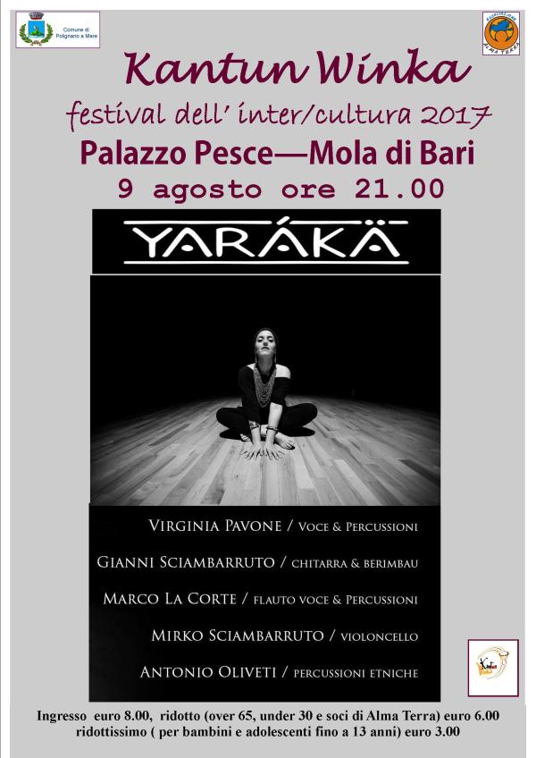 L'Ultimo appuntamento della tredicesima edizione del Festival Kantun Winka - MUSICA BRASILIANA - Yarákä in Concerto con Virginia Pavone : voce & percussioni, Marco La Corte : flauto voce & percussioni Gianni Sciambarruto : chitarra & berimbau Mirko Sciambarruto : violoncello, Antonio Oliveti : percussioni etniche. Yarákä nasce nel 2015 quando il chitarrista appassionato e... Continua a leggere →